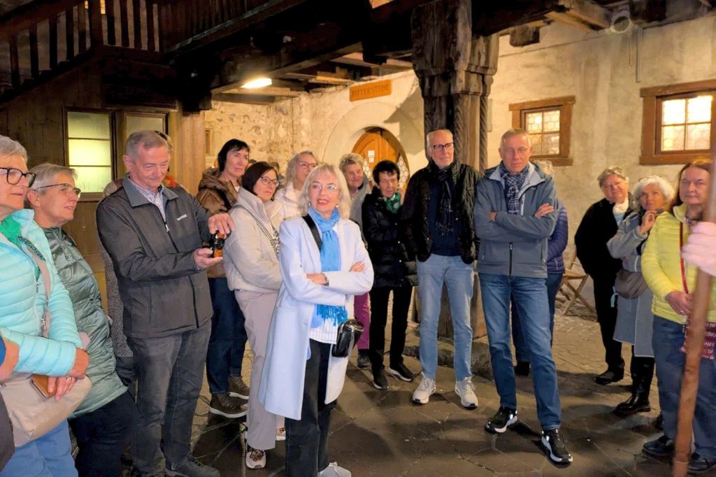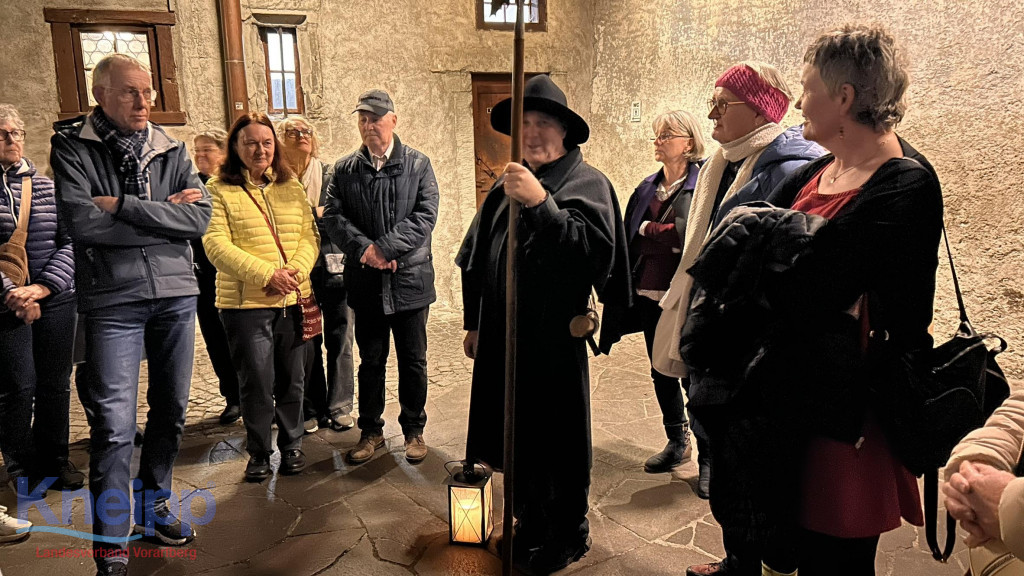 Nachtwächter Georg Fink nahm die Gruppe mit auf eine spannende Zeitreise. Mit viel Humor und Fachwissen erzählte er aus der bewegten Geschichte der Schattenburg sowie der Stadt Feldkirch und ließ so das mittelalterliche Leben wieder lebendig werden.